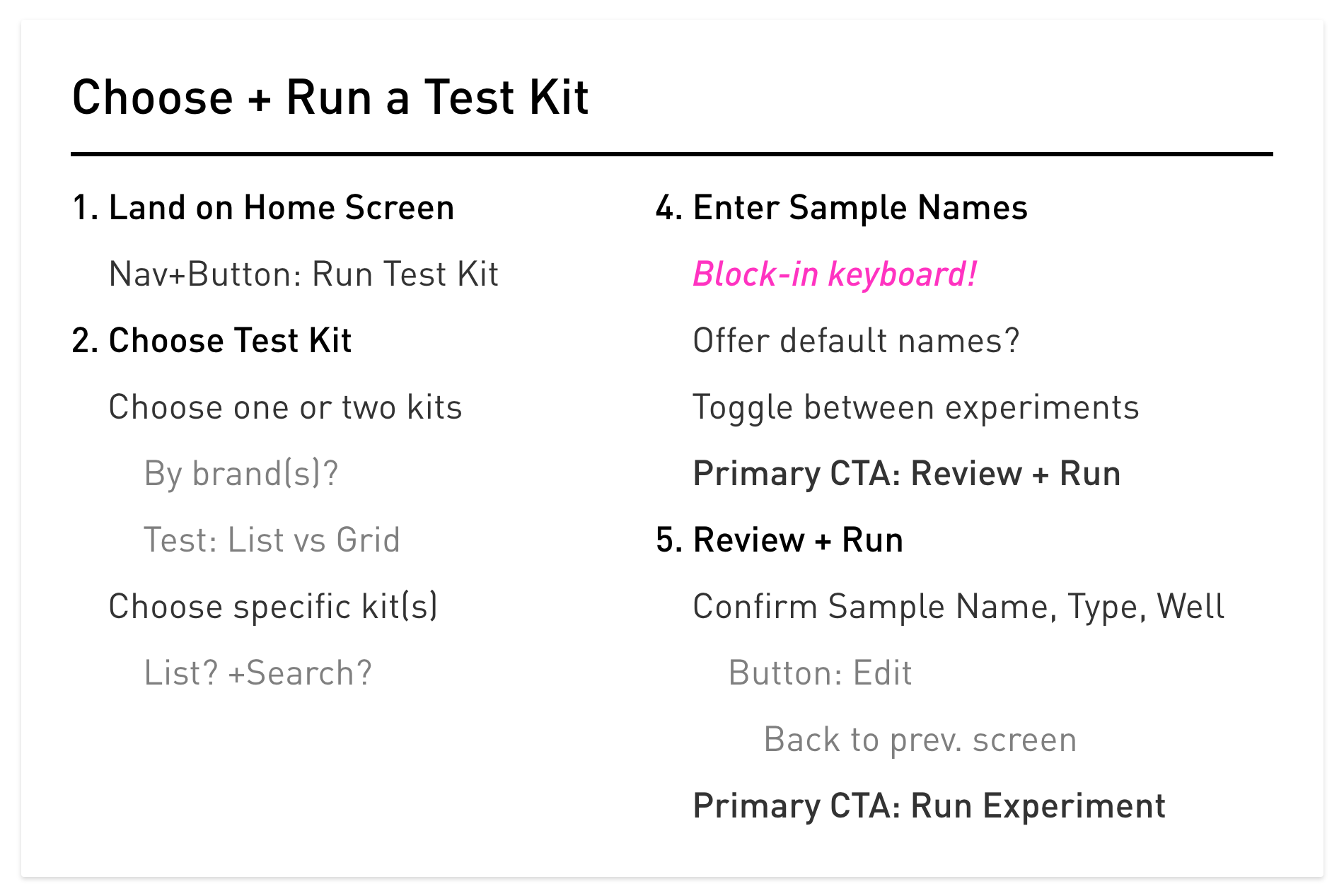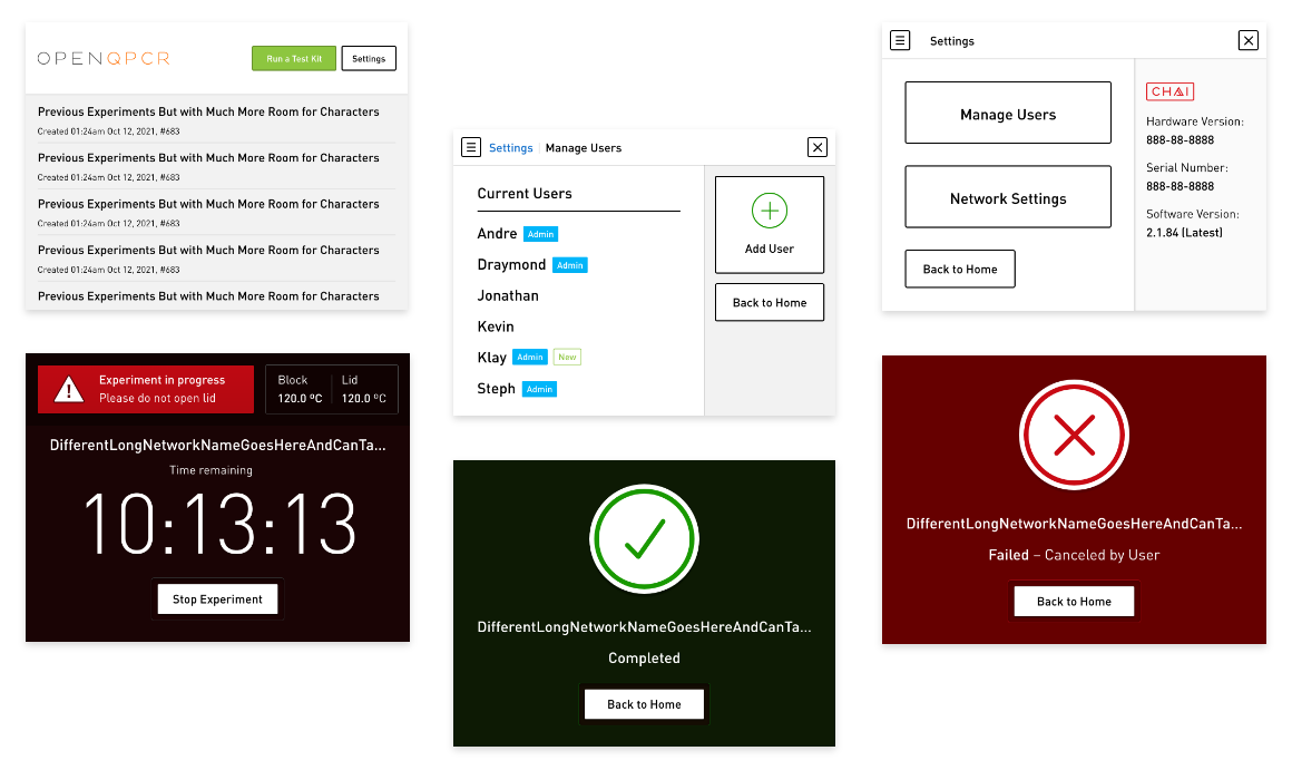 We designed the onboard LCD app to serve as the companion to our desktop software, allowing users to access and run their experiments or test kits in even the most remote locales without packing their laptop.
